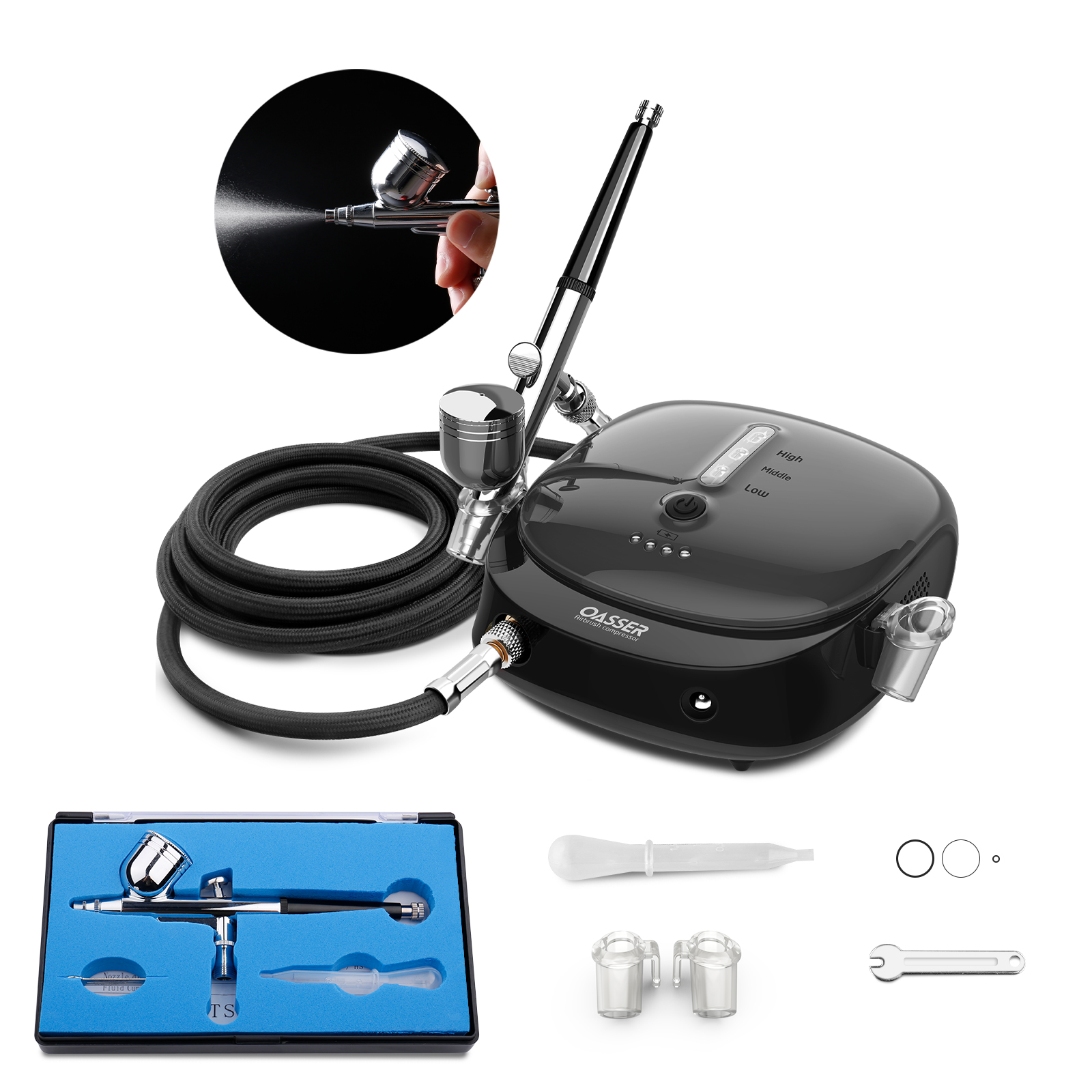 1xAirbrush Compressor; 1xAC Adapter (1.74m); 1xAir Hose (1.84m); 2xAirbrush Holder; 1xStorage Box; 1xSpanner; 1xDropper; 3xSealing Ring; 1xManual