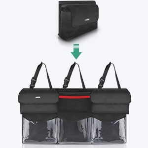 【Spacious Storage Compartments】E6 backseat trunk organizer provides 6 different-sized pockets, including 2 flap pockets, 1 mesh pocket, and 3 clear PVC-made ones. Which perfect to store car detailing supplies, first aid kit, jumper cables and reusable grocery bags.